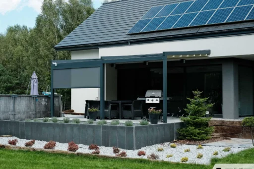 Eine revolutionäre Lösung für Terrassenpergolen. Der vollständig aufgespannte Stoff und das horizontale Vordach passen perfekt zu Ihrem Haus.