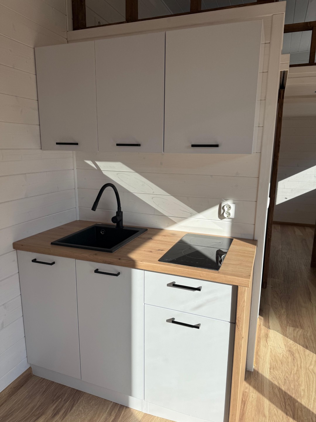 Kochnische mit zweiflammigem Elektrokochfeld, Spüle, Möbeln und Stauraum