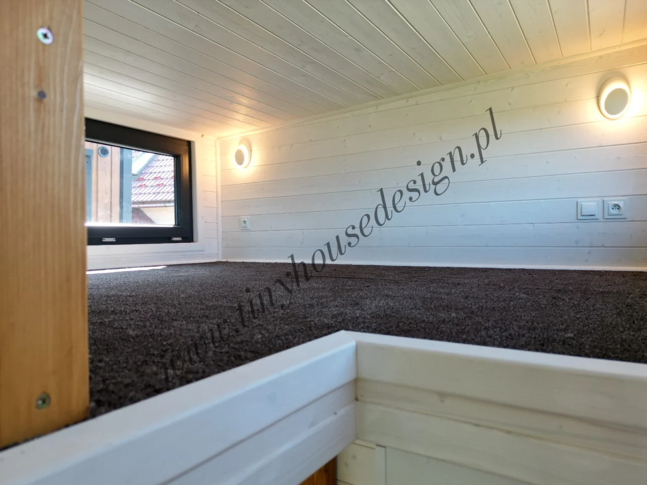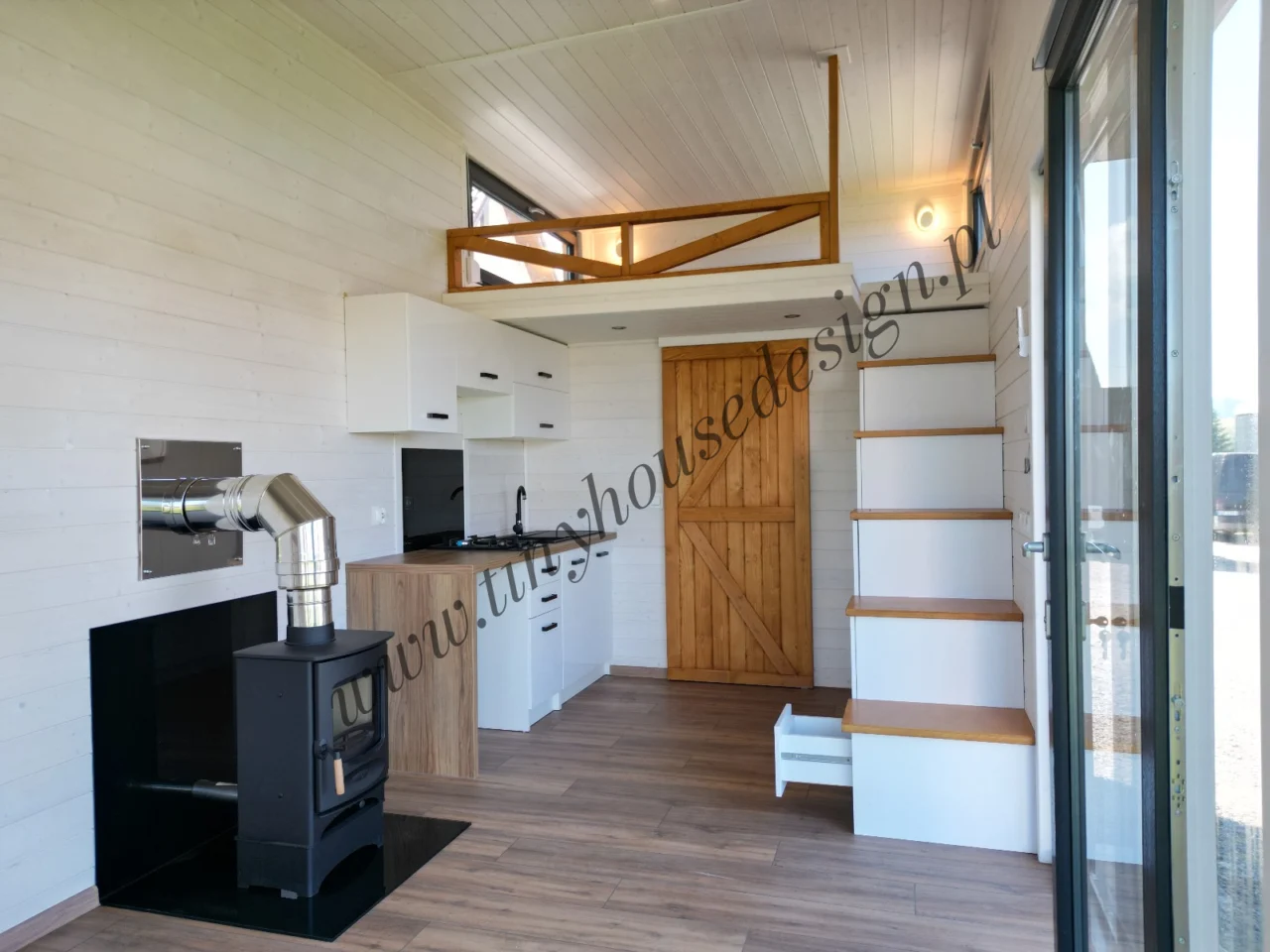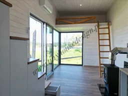 – Dachform – gerade – Innenausbau in Weiß mit Naturholz – Notwendige Installationen – Elektrik, Sanitäranlagen, betriebsbereite Sanitäranlagen oder Anschluss an das Stromnetz – Küchenzeile mit Elektroherd mit zwei Flammen und Spüle, Möbel, Stauraum – Badezimmer: Dusche, Toilette, Waschbecken – Treppe mit Schränken bis ganz nach oben – Beleuchtung – Klimaanlage – Zwei Zwischengeschosse.