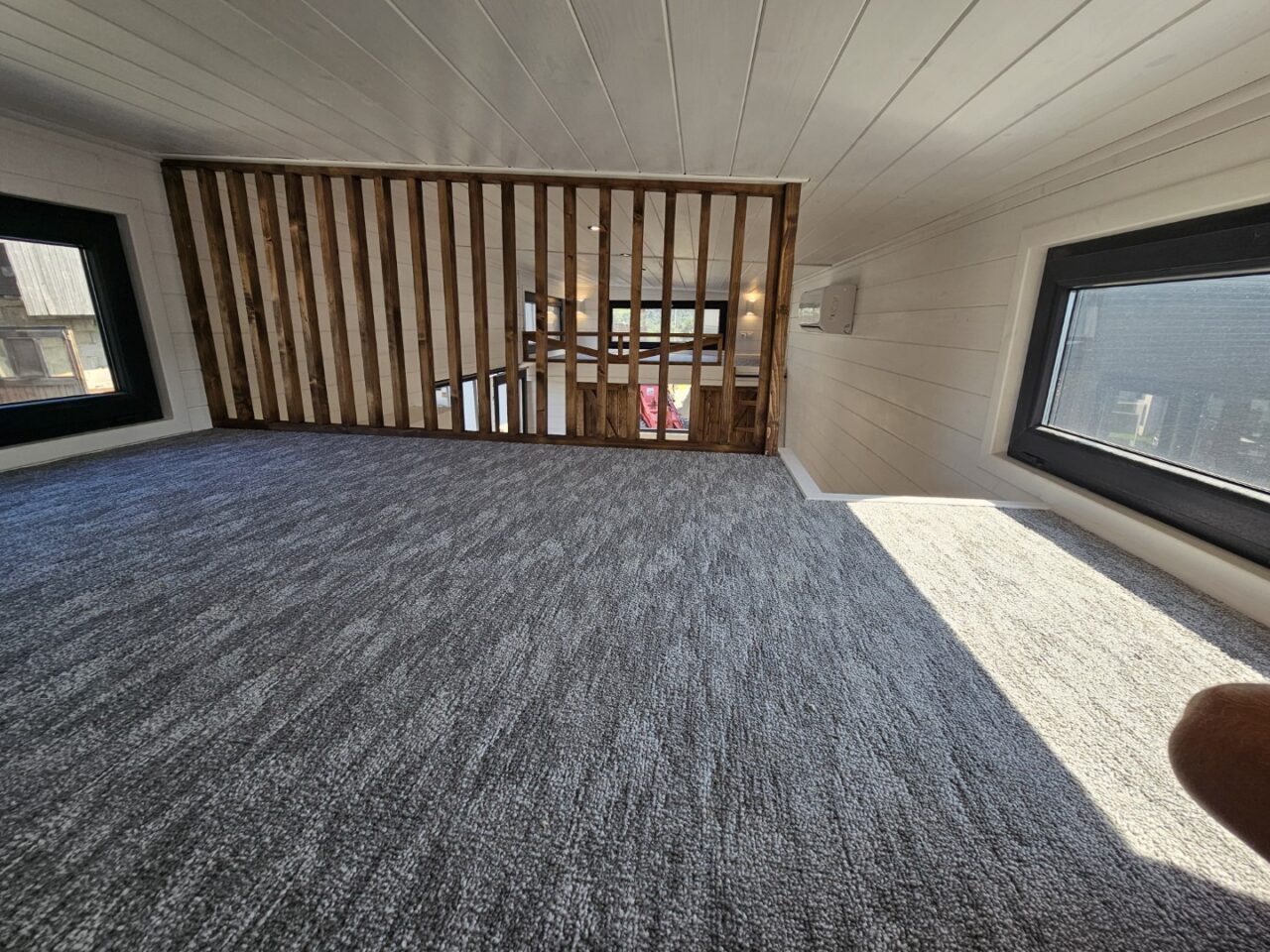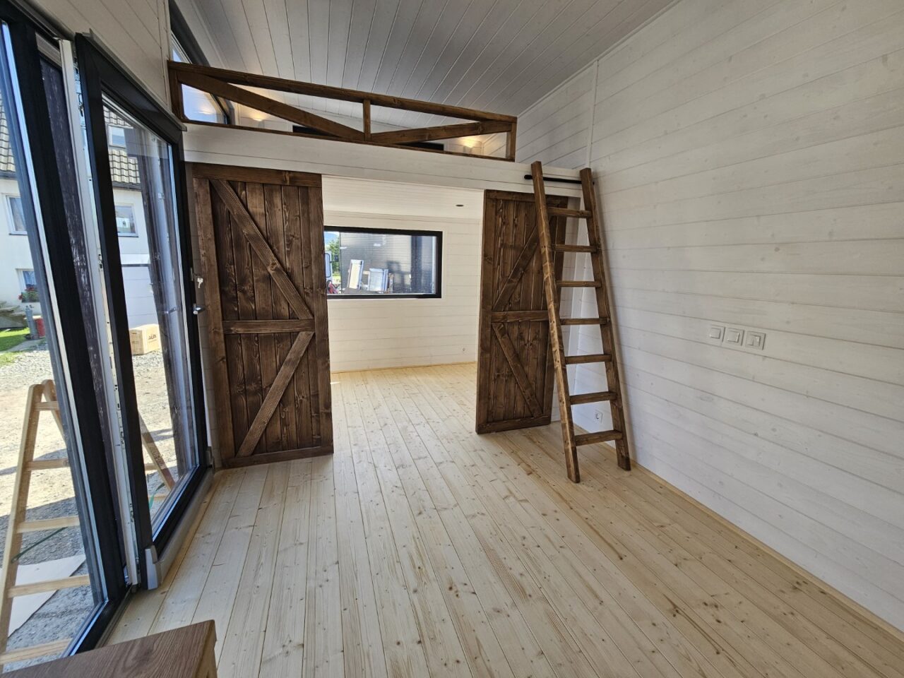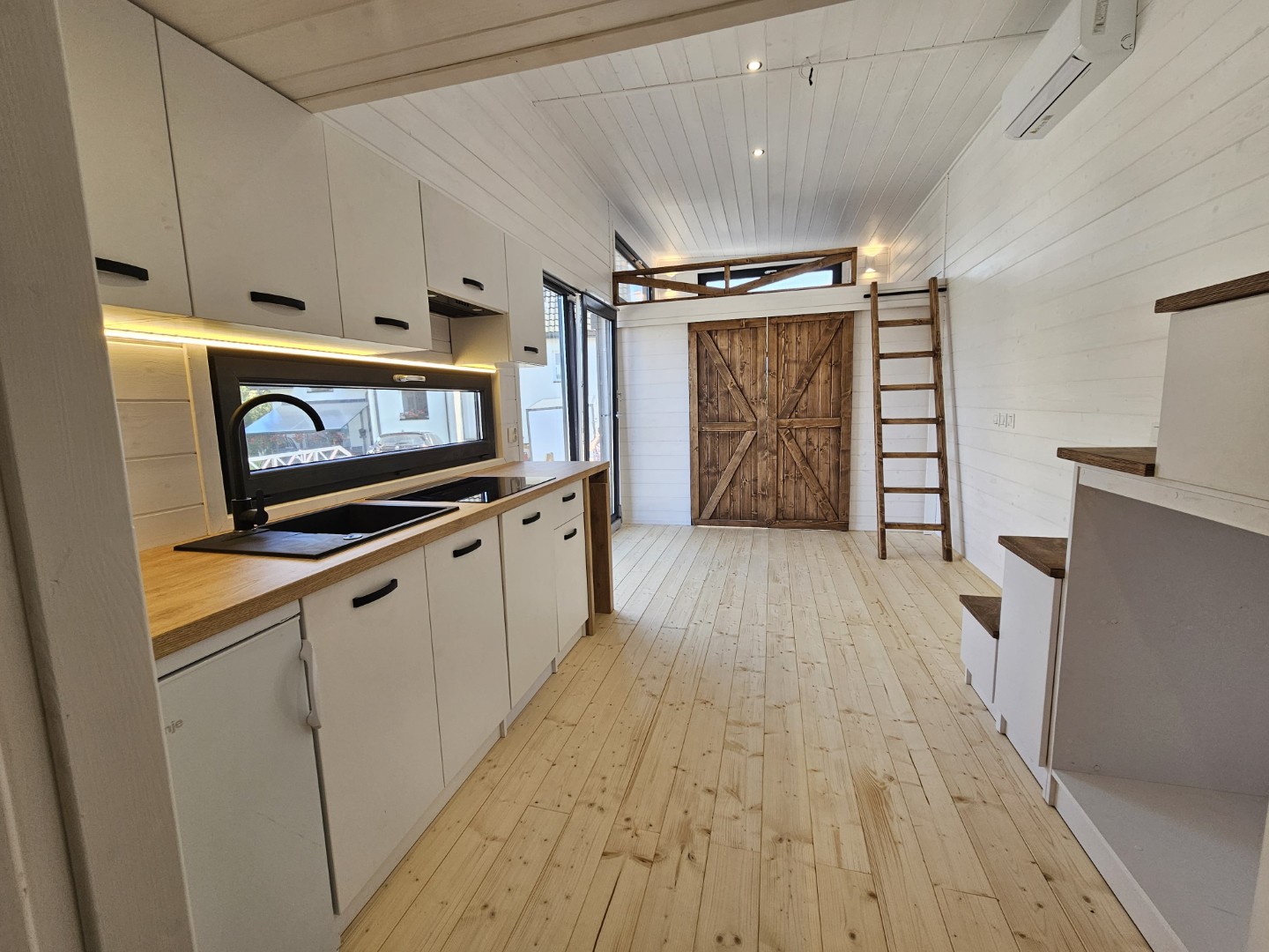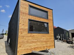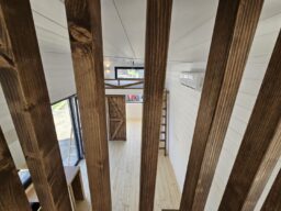 Das Mobilheim Magda ist eines der größten Cottages in unserem Angebot. Wie der Benjamin verfügt es über ein zusätzliches Zimmer, das durch eine schöne Schiebetür abgetrennt ist, und zwei Zwischengeschosse.