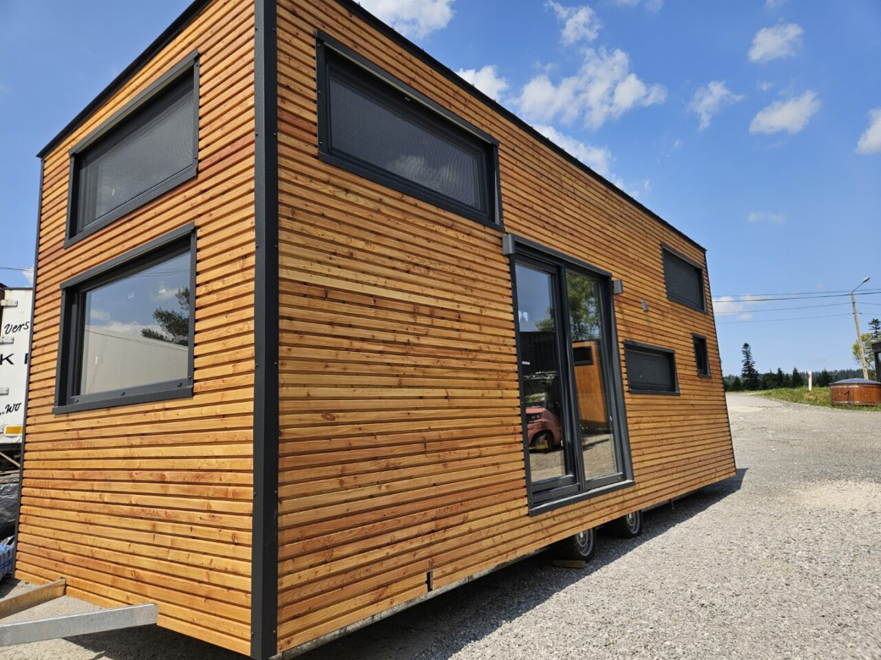 – Dachform – gerade – Innenausbau in weißem Naturholz mit dunklen Plankentüren – Notwendige Installationen – Elektrik, Sanitäranlagen, betriebsfertige Sanitäranlagen oder Anschluss an das Stromnetz – Eingang – vom Garten aus mit Glastüren – Küchenzeile mit vierflammigem Elektroherd, Spüle, Kühlschrank und Geschirrspüler – Badezimmer:
