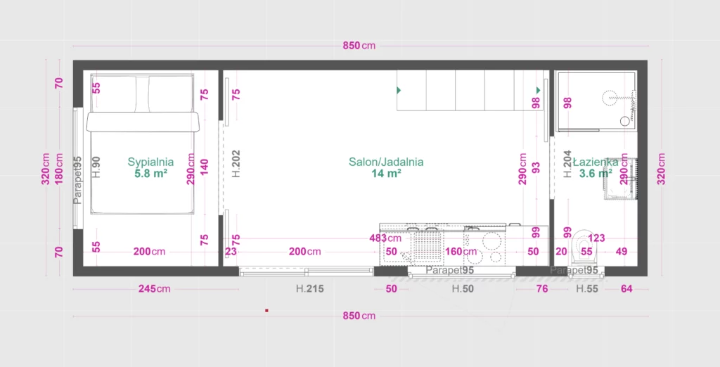 Dusche, Toilette, Waschbecken – Treppe mit Schränken ganz nach oben – Beleuchtung – Klimaanlage – Zwei Zwischengeschosse – Abmessung 320 x 850cm – Extra Zimmer