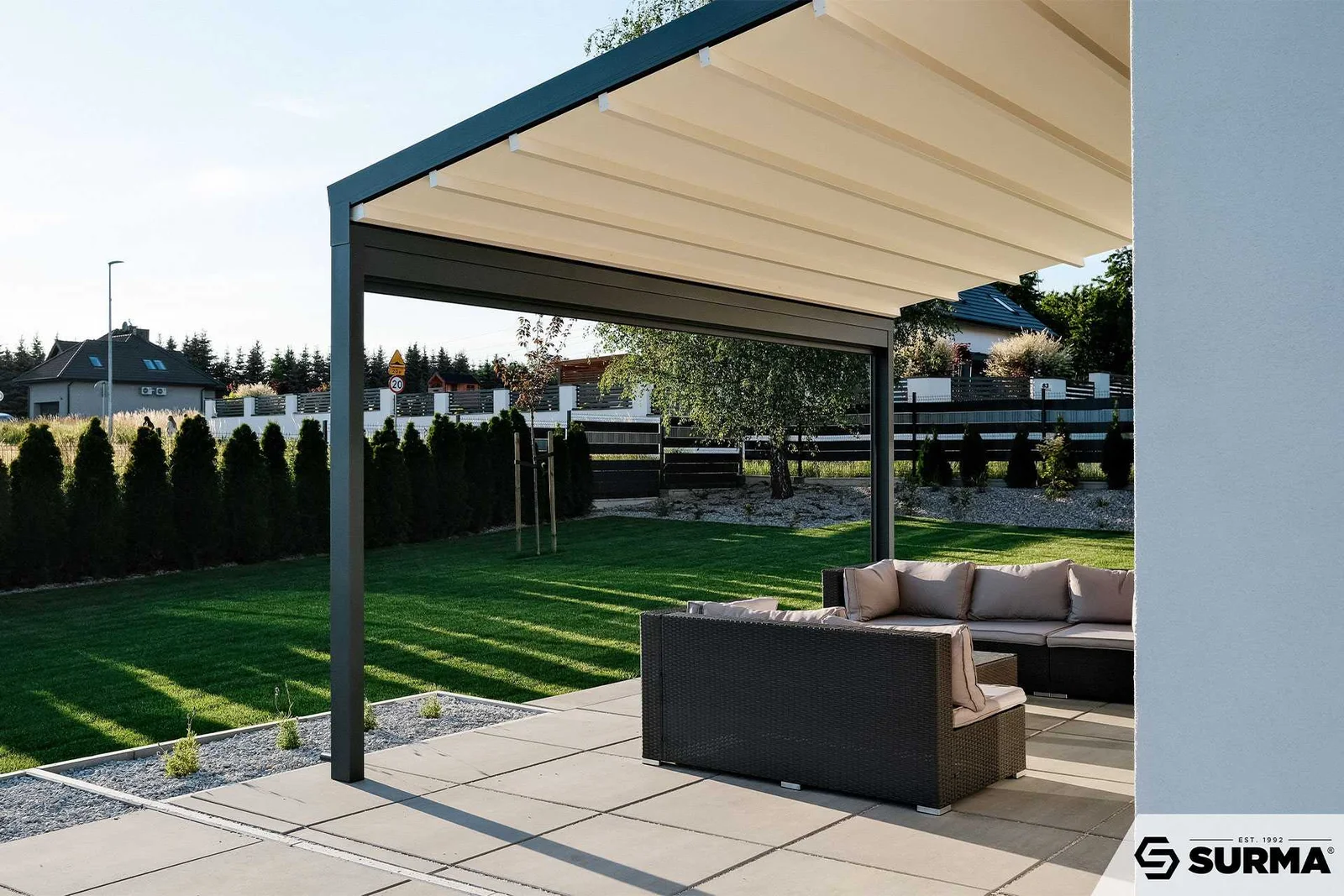 Schaffen Sie einen einzigartigen und funktionalen Entspannungsbereich, der ganz auf Ihre Bedürfnisse zugeschnitten ist. Mit der stimmungsvollen Beleuchtung und den drehbaren Dachlamellen, die Sie mit einem Klick auf die Fernbedienung aktivieren, war die Nutzung Ihres Gartens noch nie so einfach. Die Aluminiumkonstruktion und die hochwertigen Materialien sorgen dafür, dass Sie Ihre Pergola genießen können, ohne dass Sie sich um die Wartung kümmern müssen.