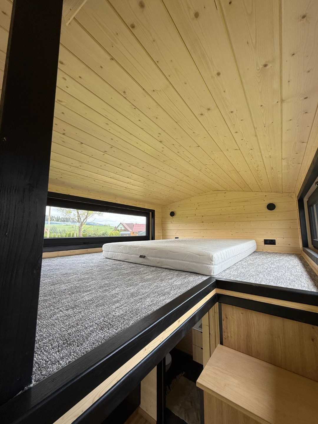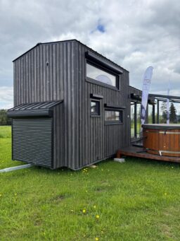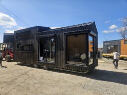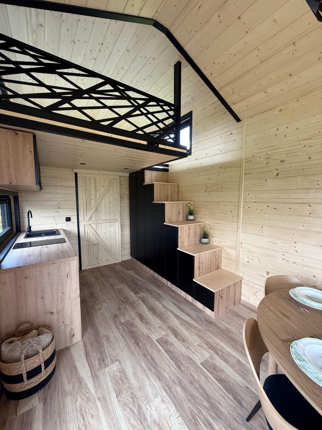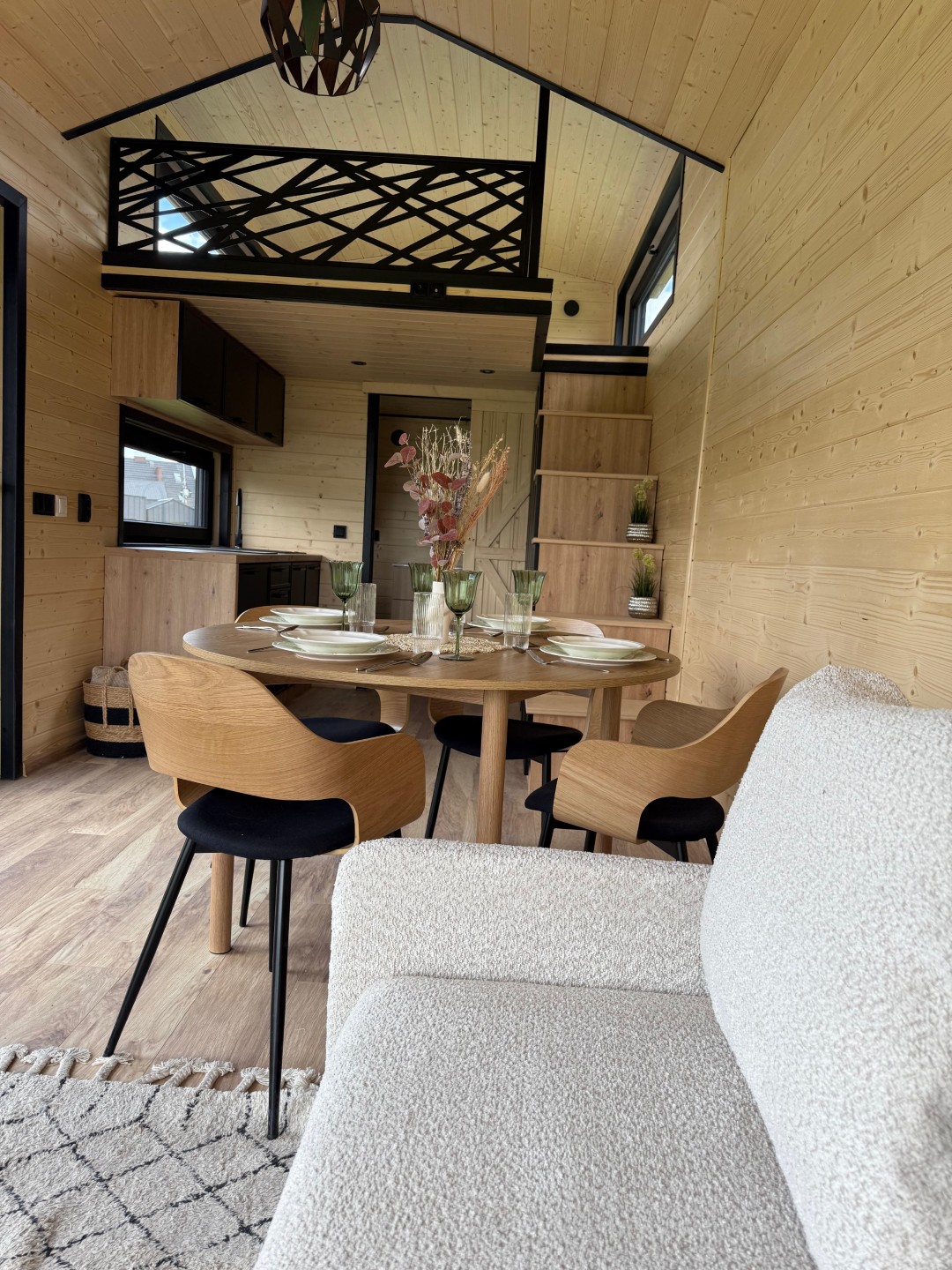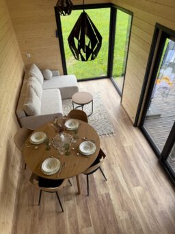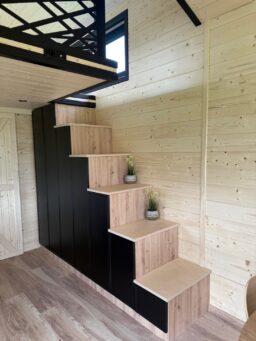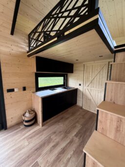 Das Mobilheim Shadow Premium besticht durch Großzügigkeit und Eleganz. Die Kombination aus Naturholz und schwarzen Elementen verleiht dem Interieur eine besonders gemütliche und stilvolle Atmosphäre. Im Obergeschoss befindet sich ein komfortables Schlafzimmer mit Panoramafenstern in zwei Himmelsrichtungen.