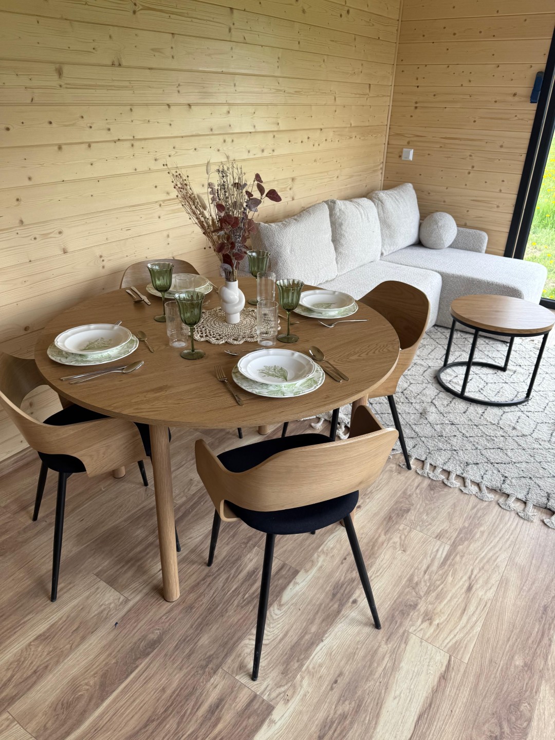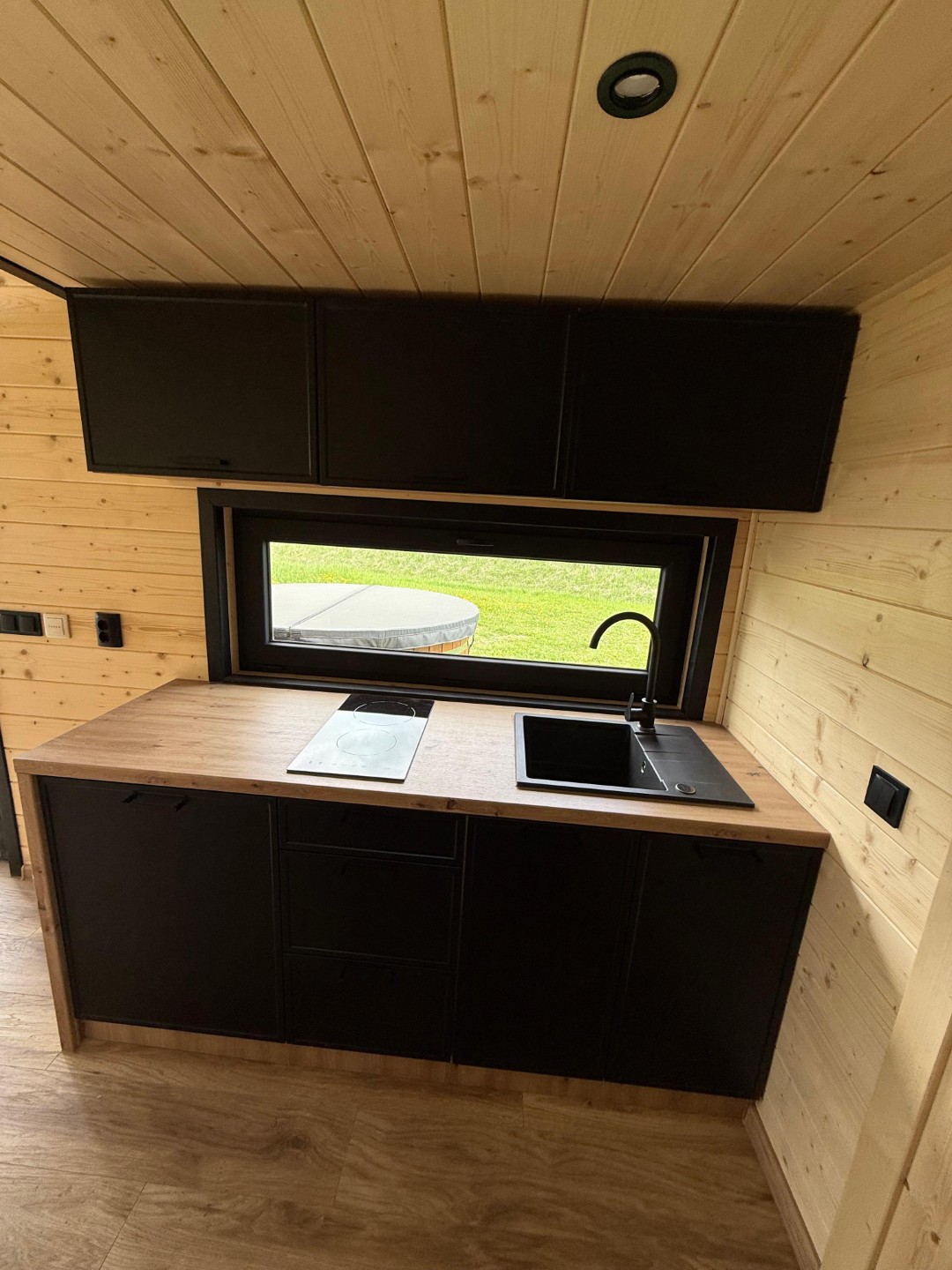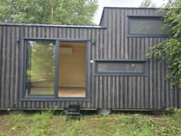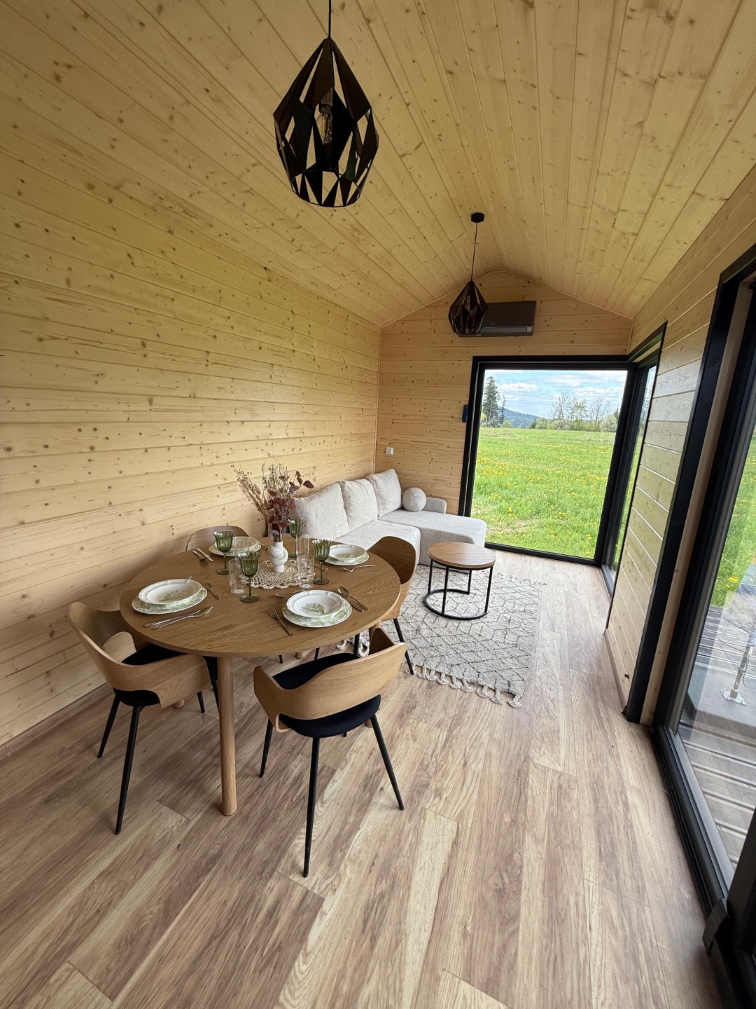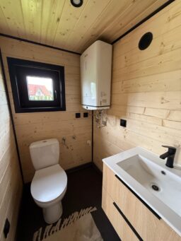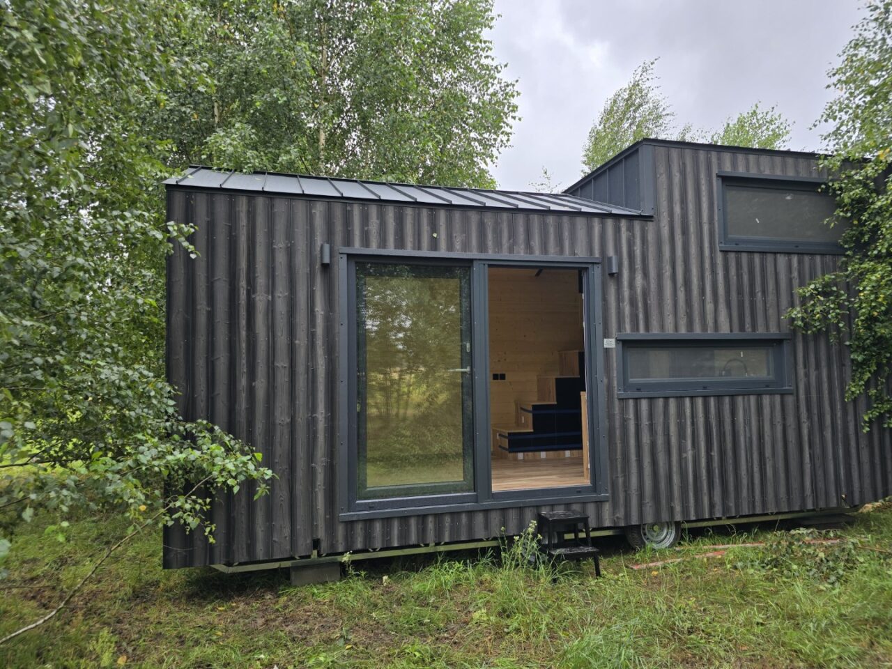 Das Mobilheim Shadow Premium besticht durch Großzügigkeit und Eleganz. Die Kombination aus Naturholz und schwarzen Elementen verleiht dem Interieur eine besonders gemütliche und stilvolle Atmosphäre. Im Obergeschoss befindet sich ein komfortables Schlafzimmer mit Panoramafenstern in zwei Himmelsrichtungen.