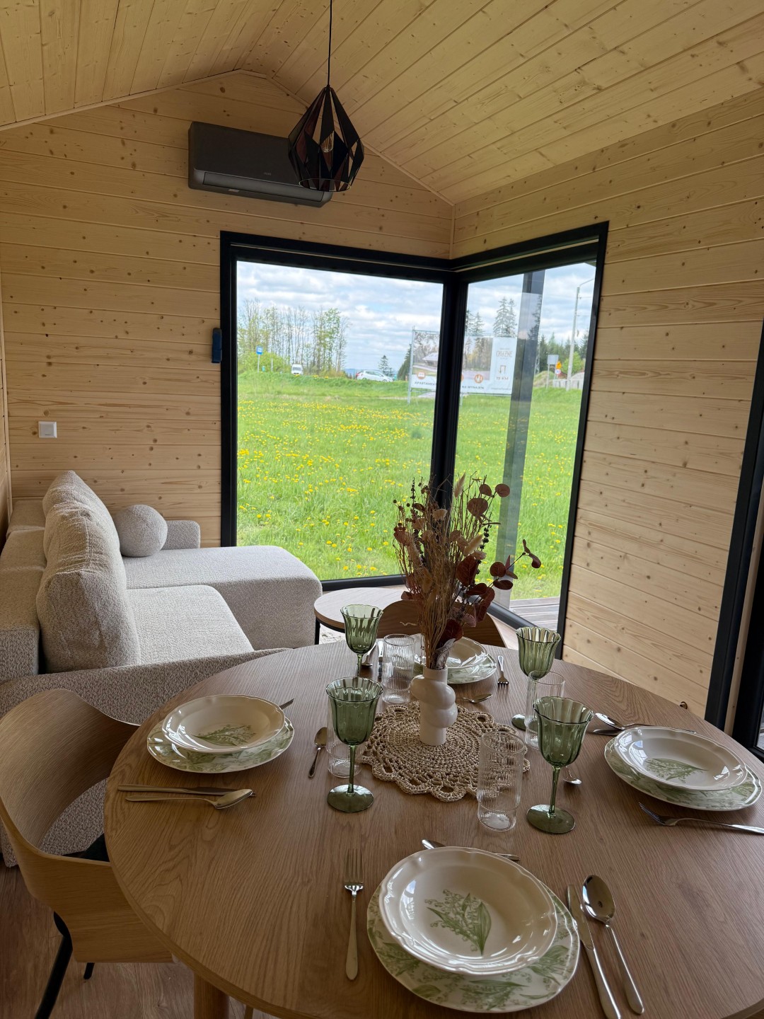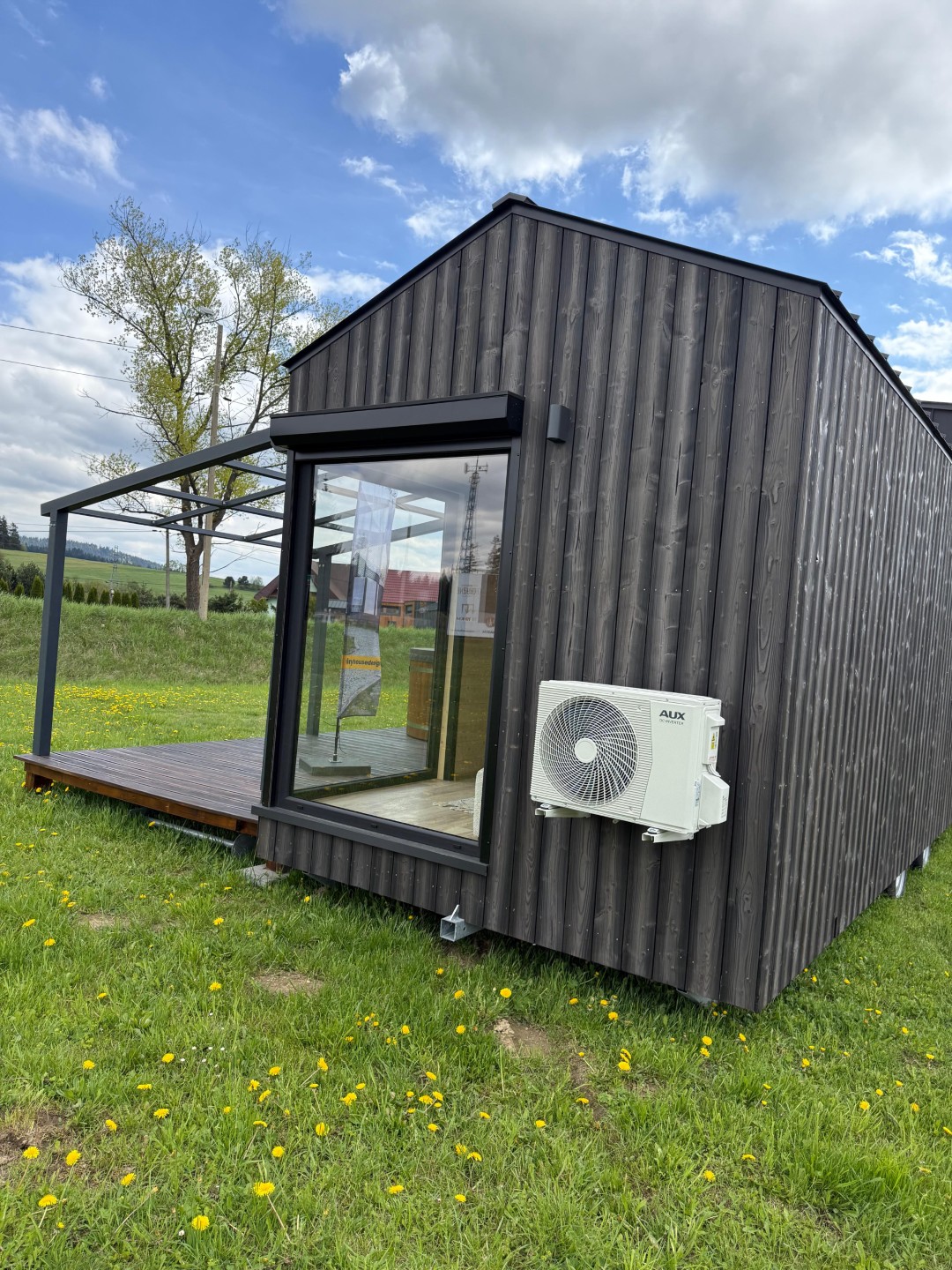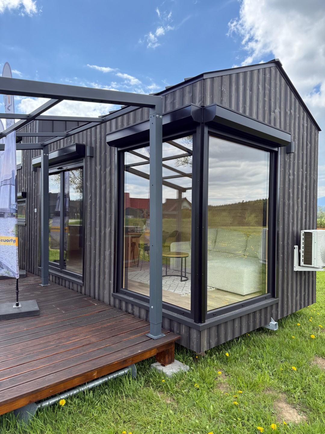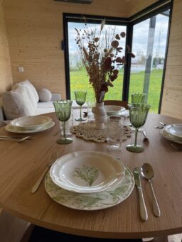 Das Mobilheim Shadow Premium besticht durch Großzügigkeit und Eleganz. Die Kombination aus Naturholz und schwarzen Elementen verleiht dem Interieur eine besonders gemütliche und stilvolle Atmosphäre. Im Obergeschoss befindet sich ein komfortables Schlafzimmer mit Panoramafenstern in zwei Himmelsrichtungen.
