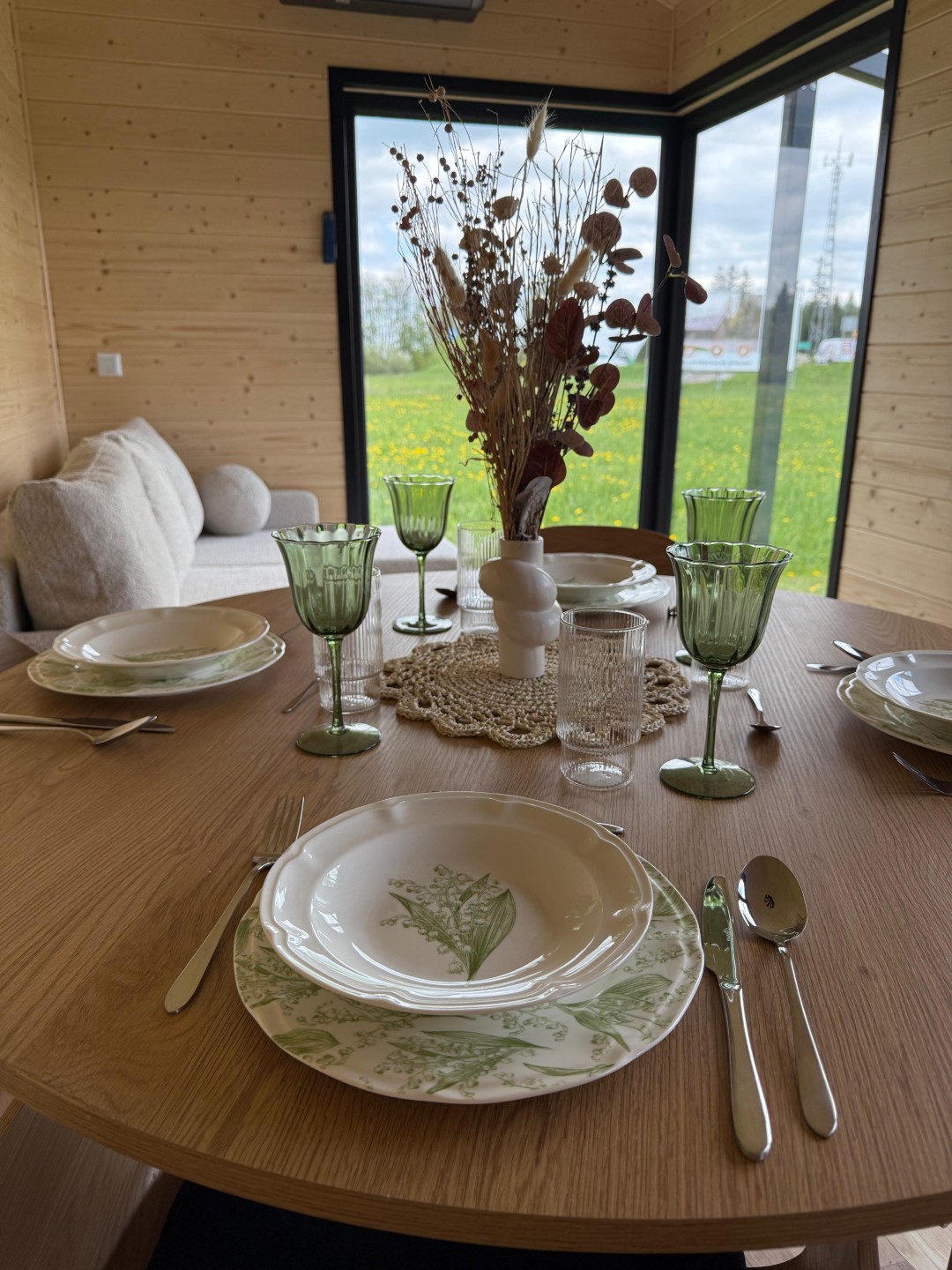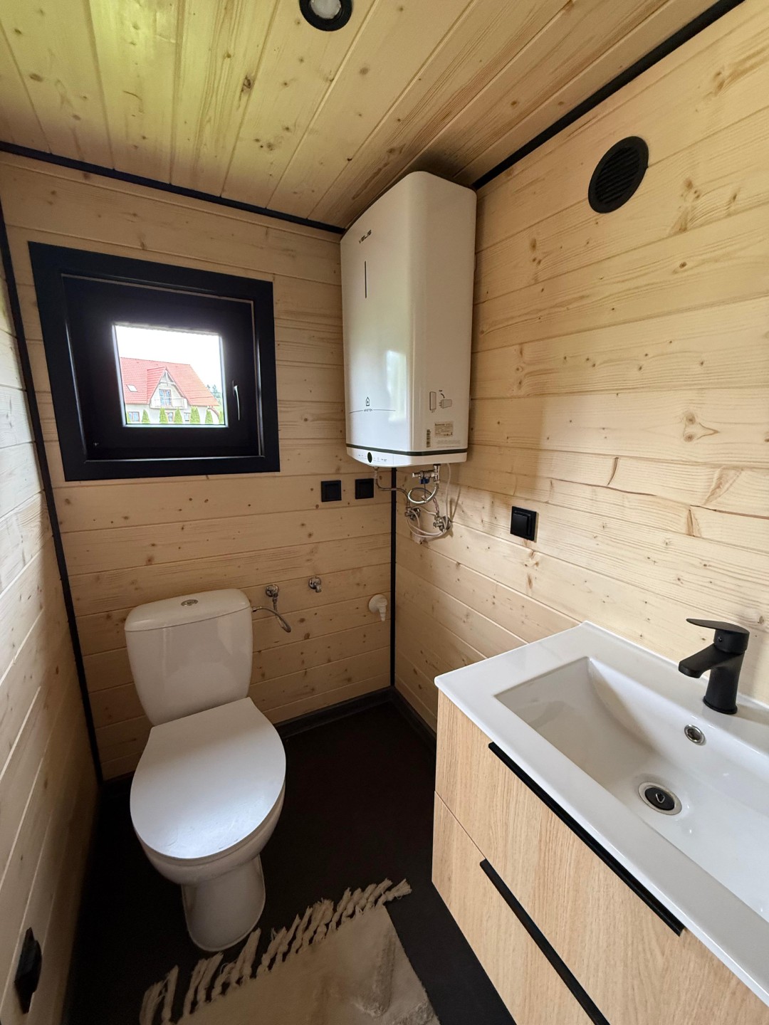 Das Erdgeschoss ist funktional und großzügig gestaltet. Hier finden Sie eine voll ausgestattete Kochnische, zahlreiche Schränke und ein Badezimmer. Das Eckfenster im Wohnzimmer lässt viel Tageslicht herein und bietet einen schönen Ausblick direkt von der gemütlichen Couch.