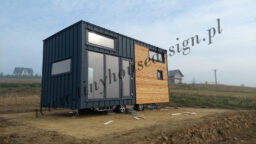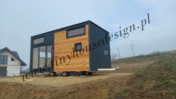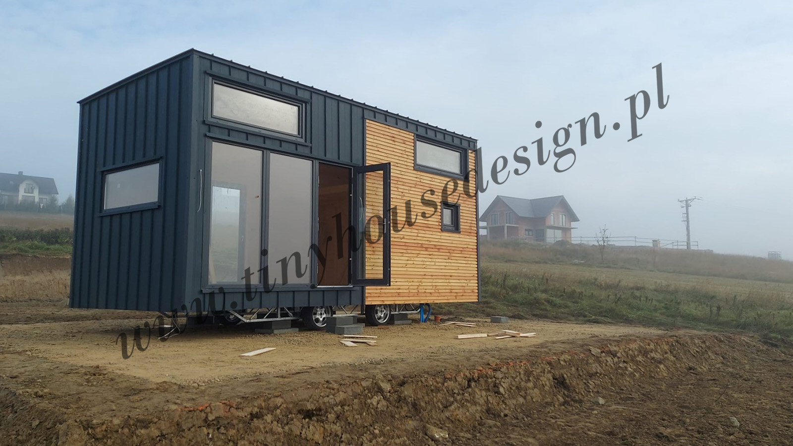Auf einem Anhänger gebautes Haus. Es ist in verschiedenen Größen erhältlich, je nach den Bedürfnissen des Kunden. Der Bungalow verfügt über eine moderne und hochwertige Paneelverkleidung mit einem neuen Falzsystem und Holz.