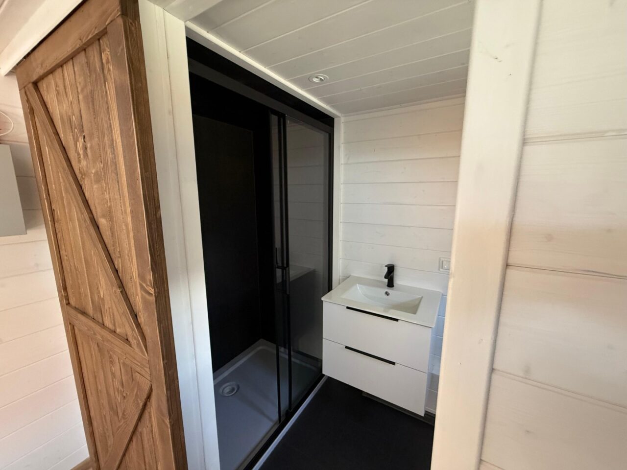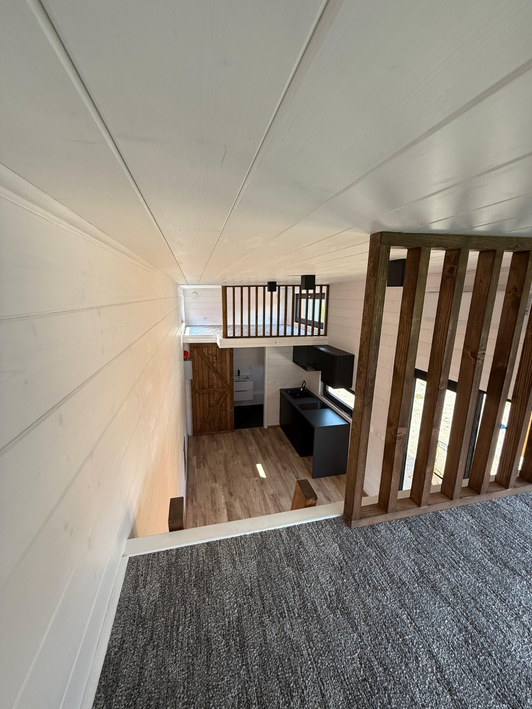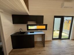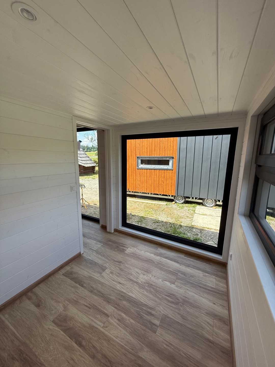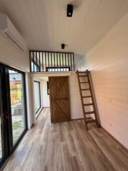 –Wnętrze: wykończone na biało naturalnym drewnem, z drzwiami z ciemnych desek