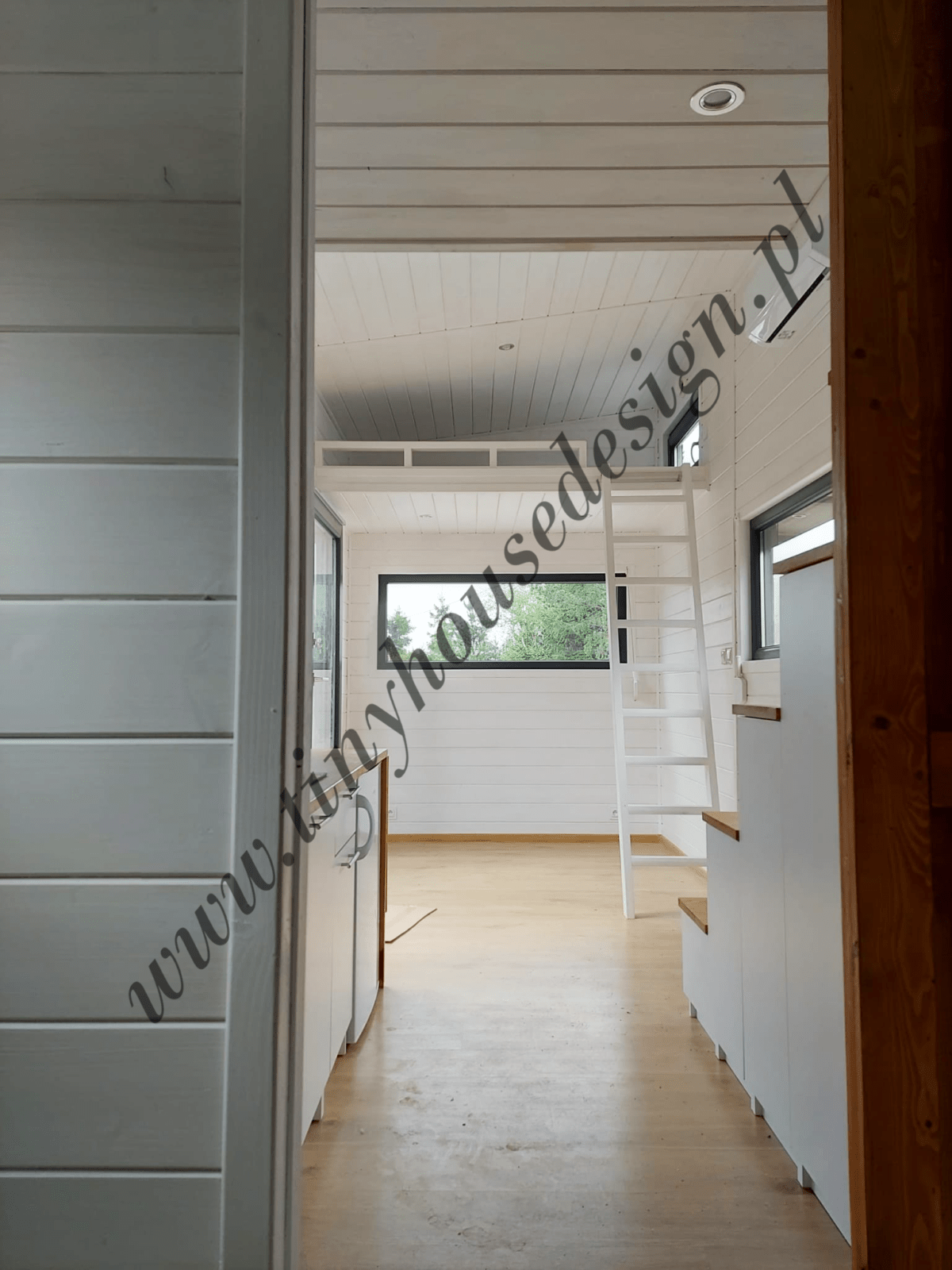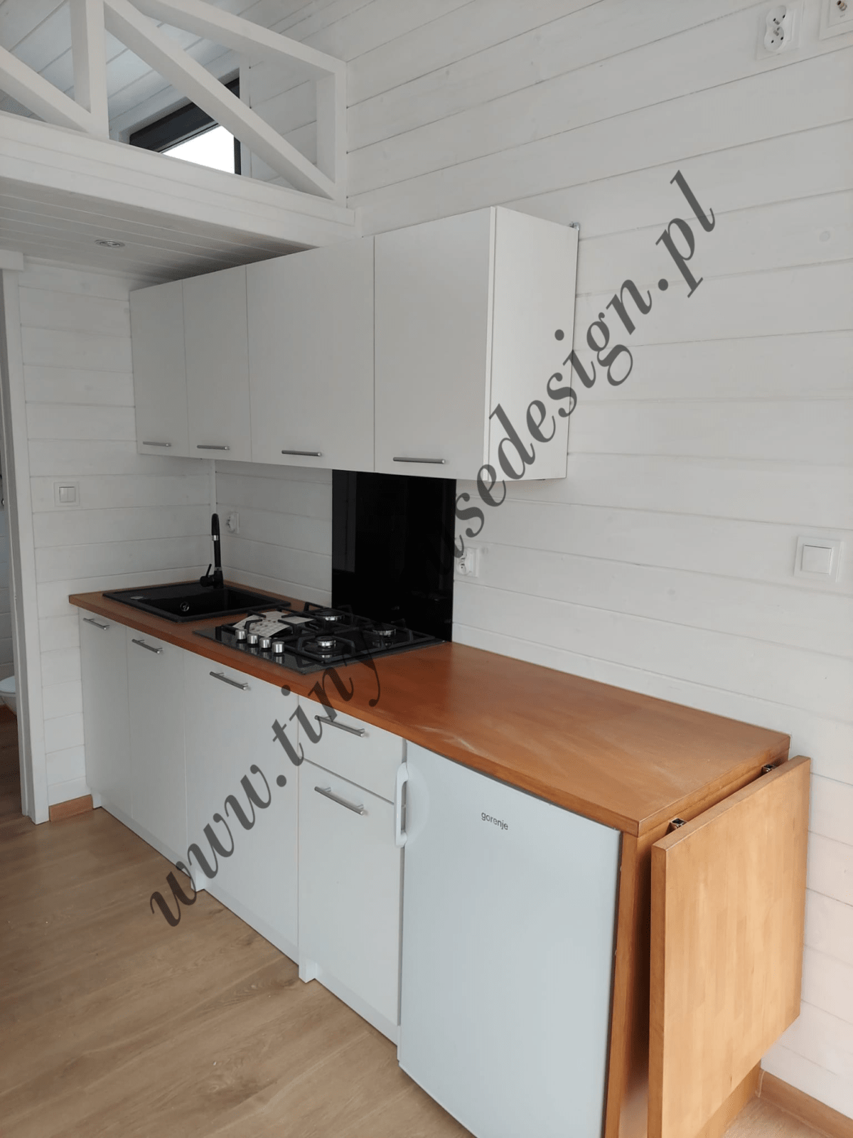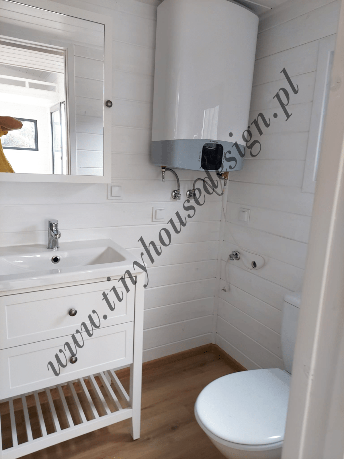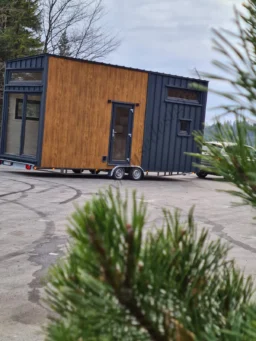 Pflegeleicht, in Anthrazit oder holzähnlicher Farbe, ästhetisch und langlebig. – Innenausstattung in Weiß mit Naturholz – Notwendige Installationen – Elektrik, Sanitär, Kanalisation betriebsbereit oder Anschluss an das Stromnetz – Eingang – vom Garten aus mit einer Glastür.