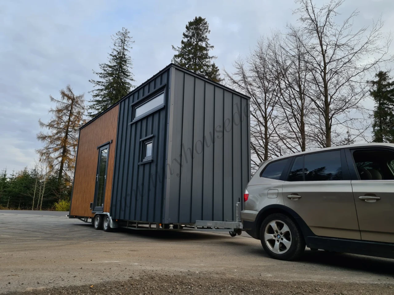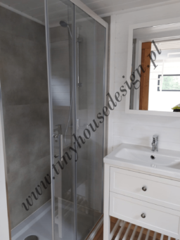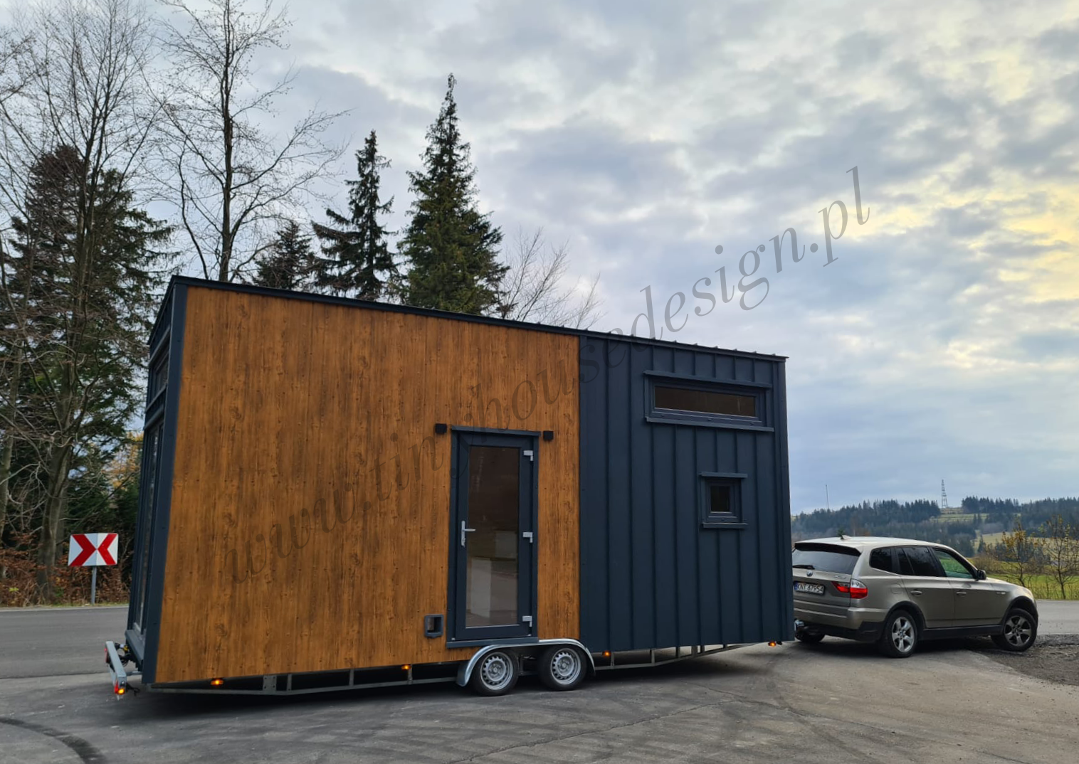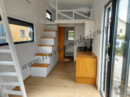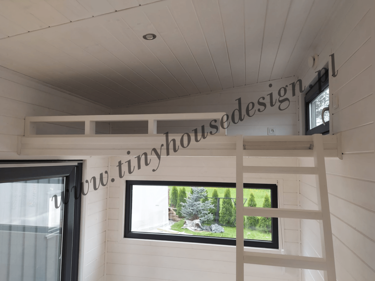 Pflegeleicht, in Anthrazit oder holzähnlicher Farbe, ästhetisch und langlebig. – Innenausstattung in Weiß mit Naturholz – Notwendige Installationen – Elektrik, Sanitär, Kanalisation betriebsbereit oder Anschluss an das Stromnetz – Eingang – vom Garten aus mit einer Glastür.