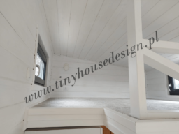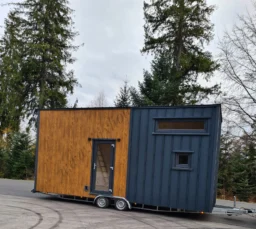 Bei diesem Projekt haben wir uns für eine einfache rechteckige Form mit einem Pultdach entschieden. Auf den ca. 24 m2 Wohnfläche dieses Mobilheims befinden sich zwei komfortable Schlafzimmer im Zwischengeschoss.